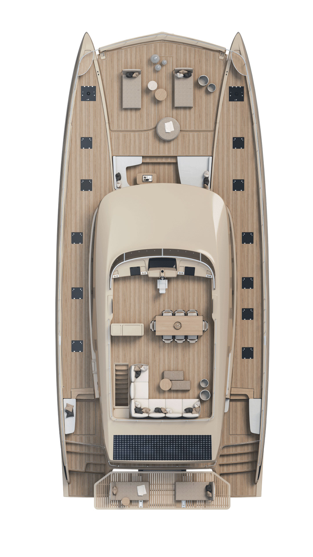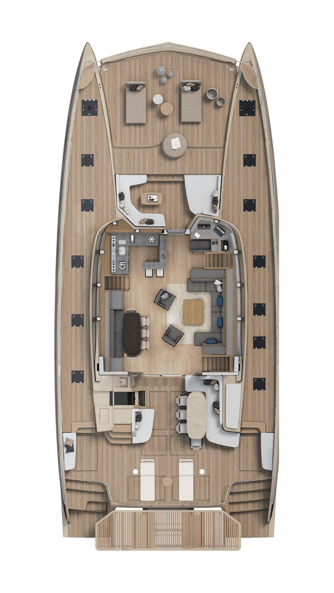 Il suo design promette 300 m² di spazi esterni dedicati al relax, con in particolare nella parte posteriore una piattaforma fino a 22 m².