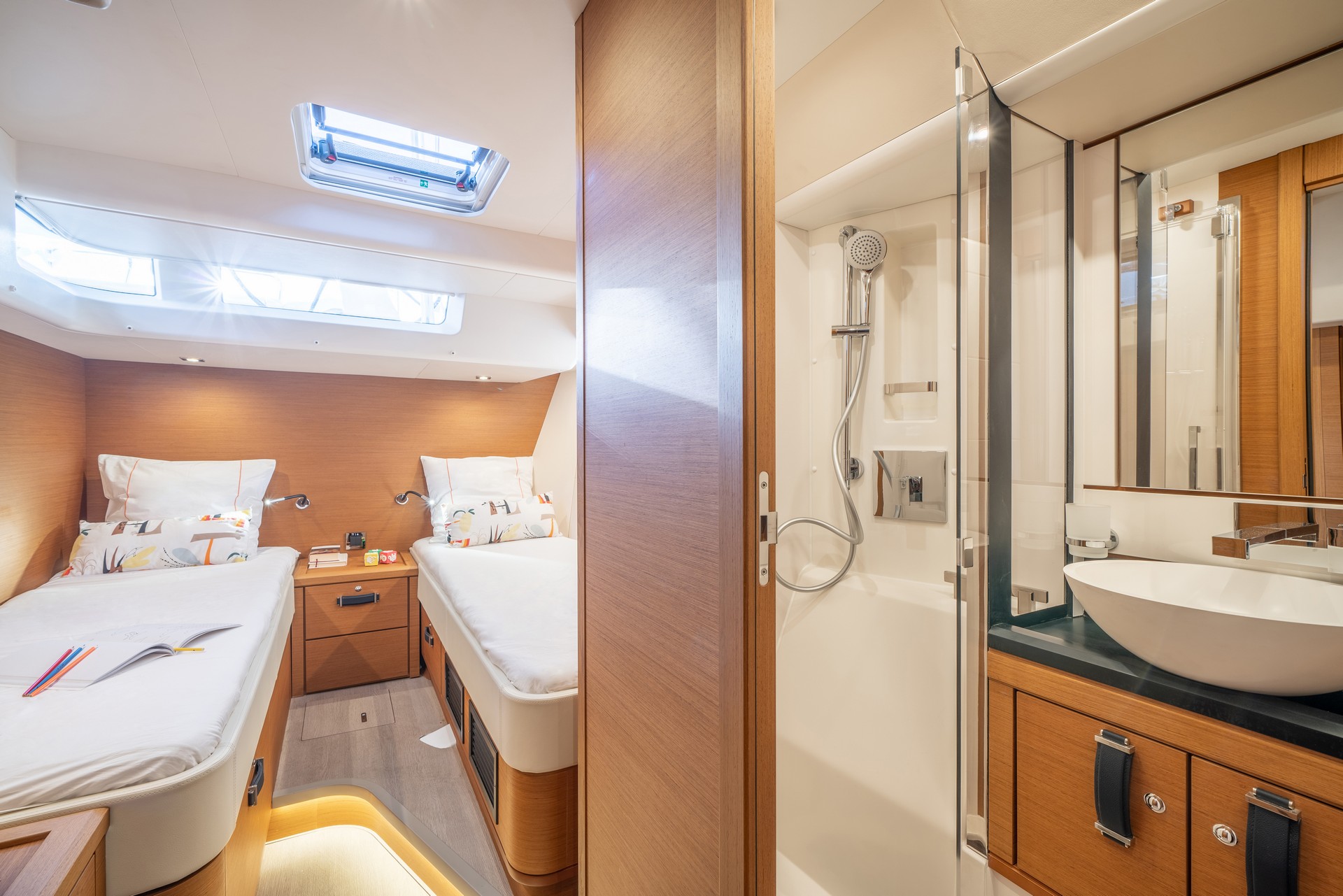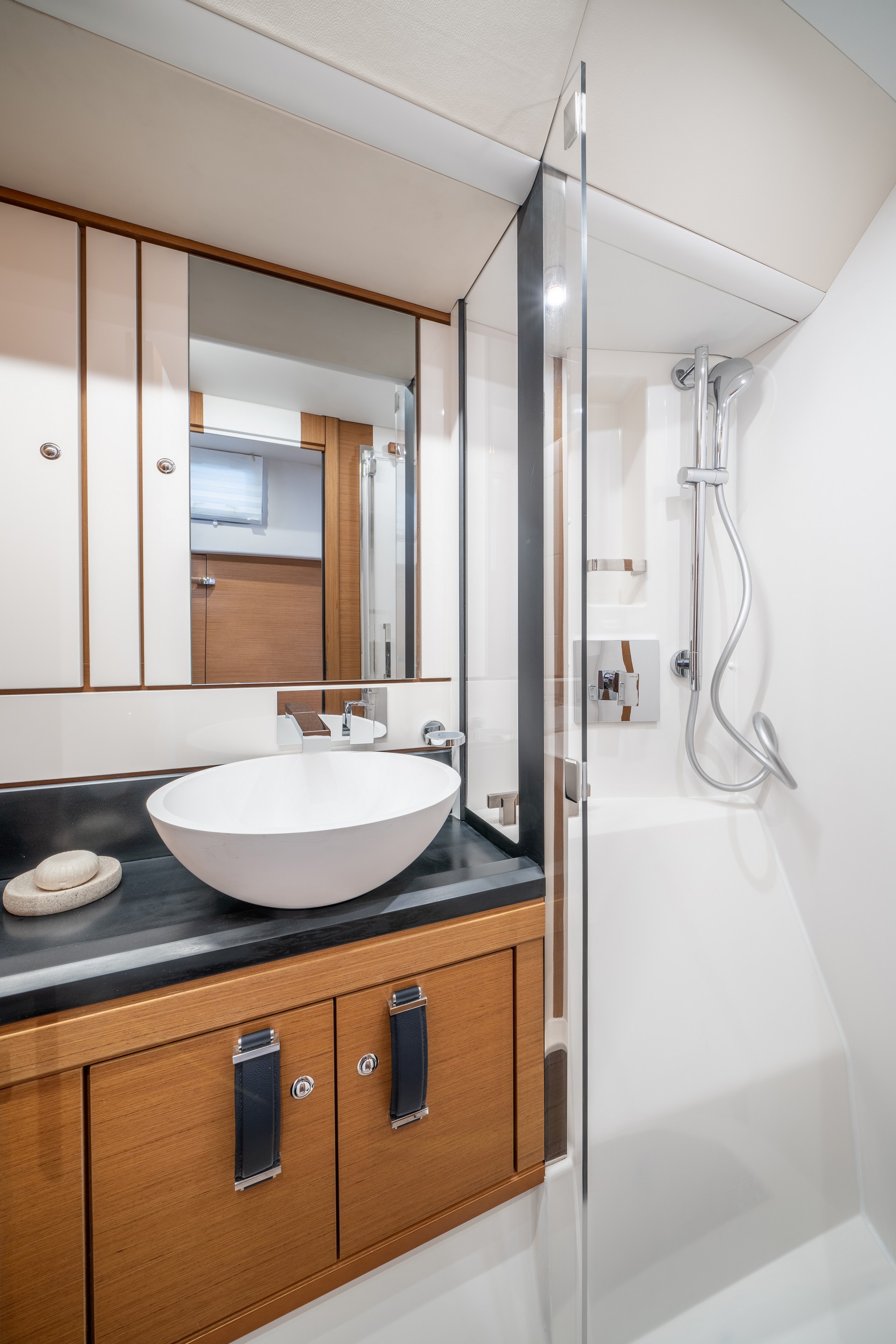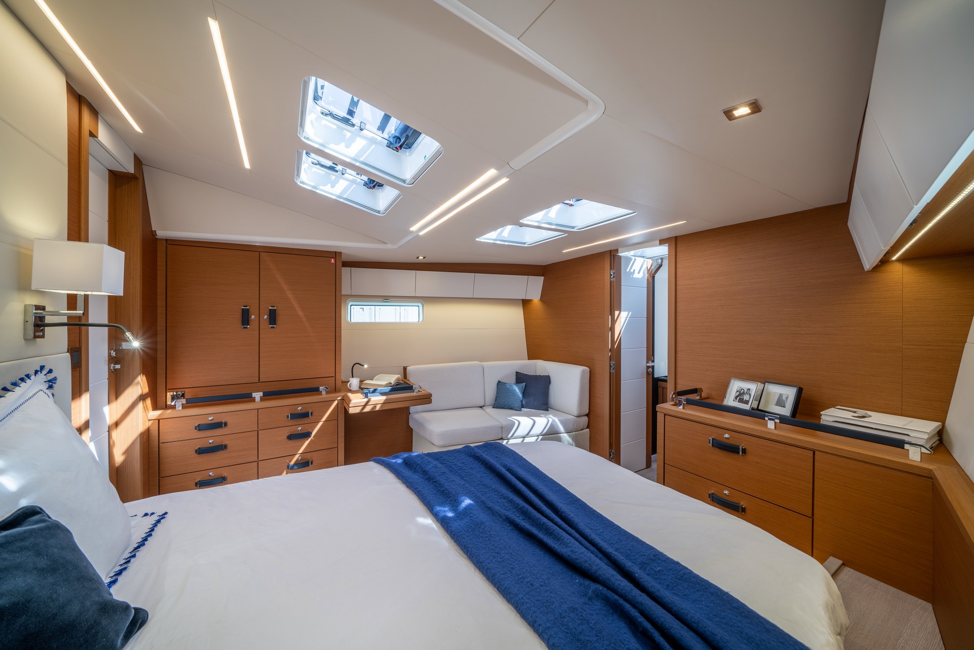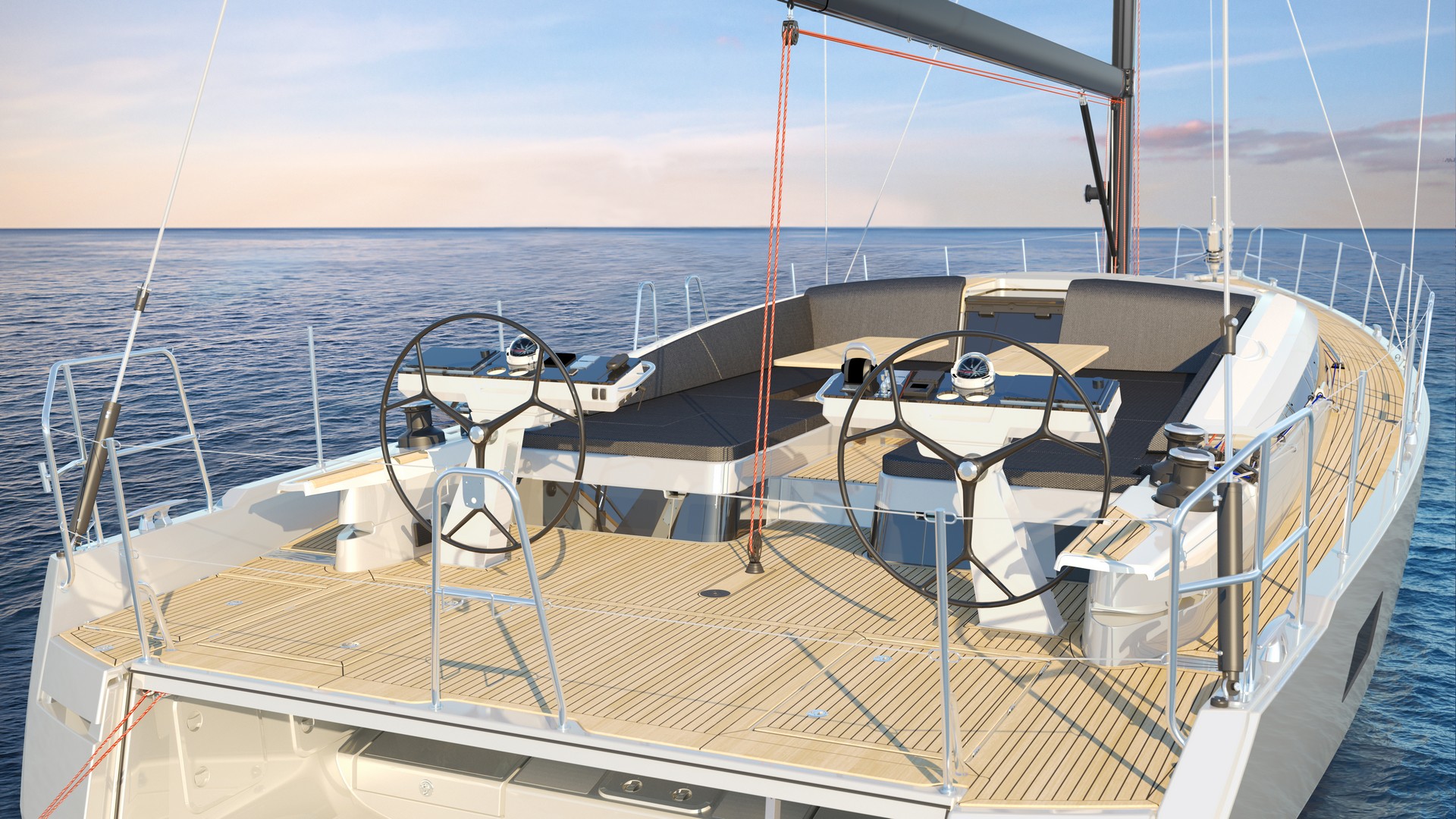 Gli spostamenti, l’accesso alle manovre, lo stivaggio e il comfort in mare e in rada sono stati curati nei minimi dettagli: specchio di poppa trasformabile in un’immensa piattaforma da bagno per accedere al garage del tender, pozzetto XXL dotato di tavoli che si abbassano elettricamente per trasformarsi in prendisole, fluidità degli spostamenti sul flush-deck….