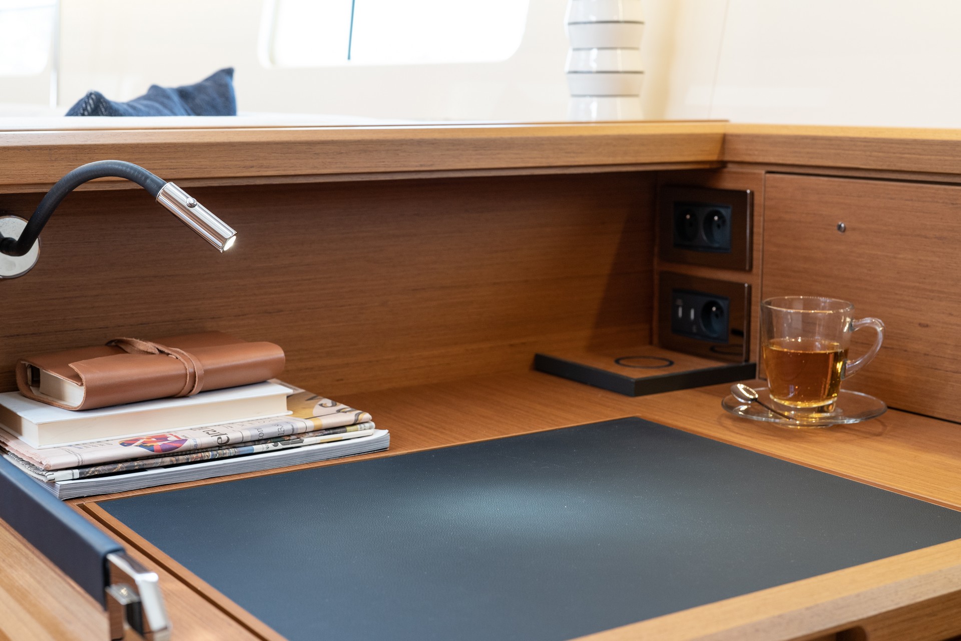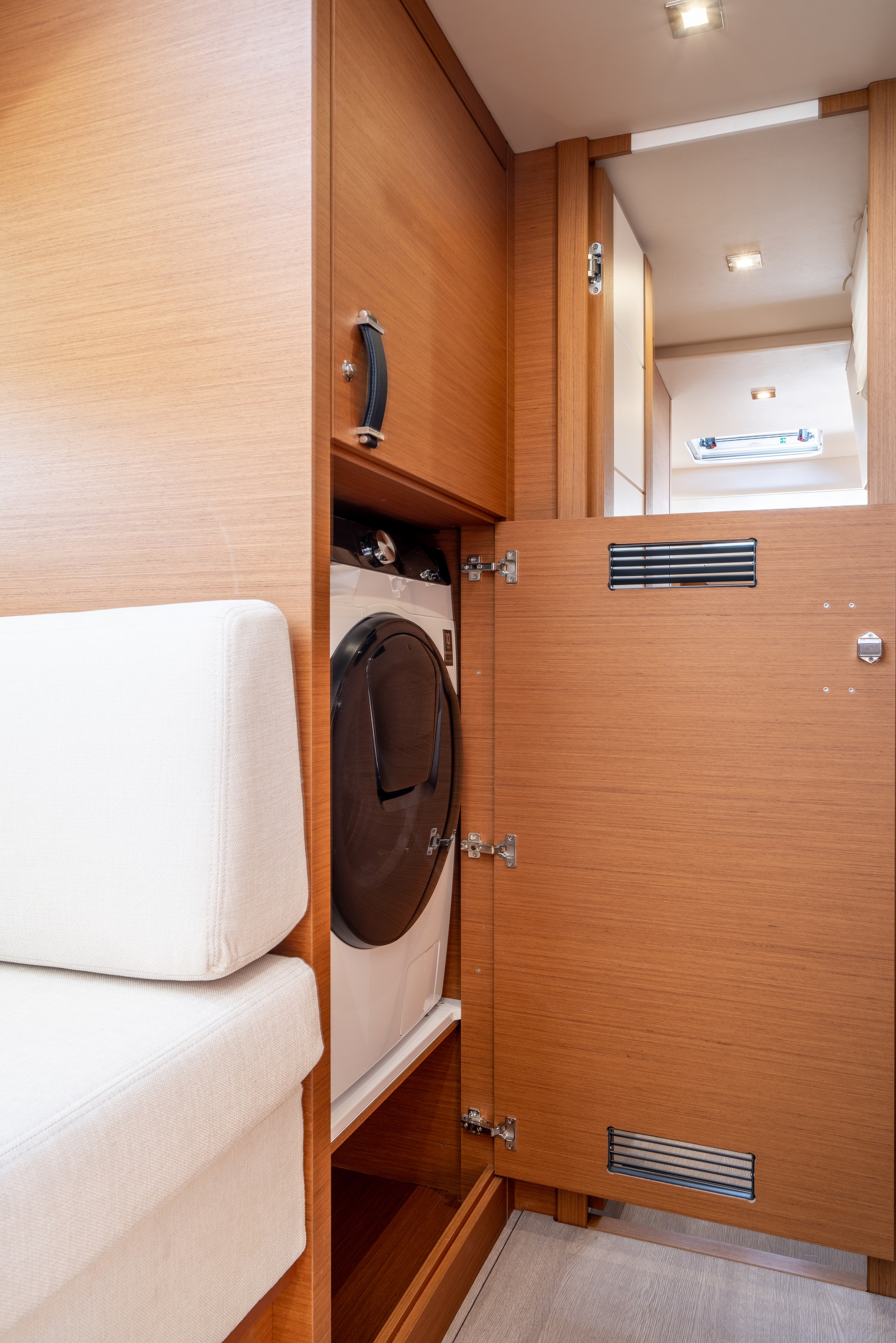 I rivestimenti in legno teck o rovere bianco, entrambi a poro aperto, sono armonizzati con una scelta di colori per pavimenti e un’ampia selezione di rivestimenti in pelle consentendo così di personalizzare gli interni.