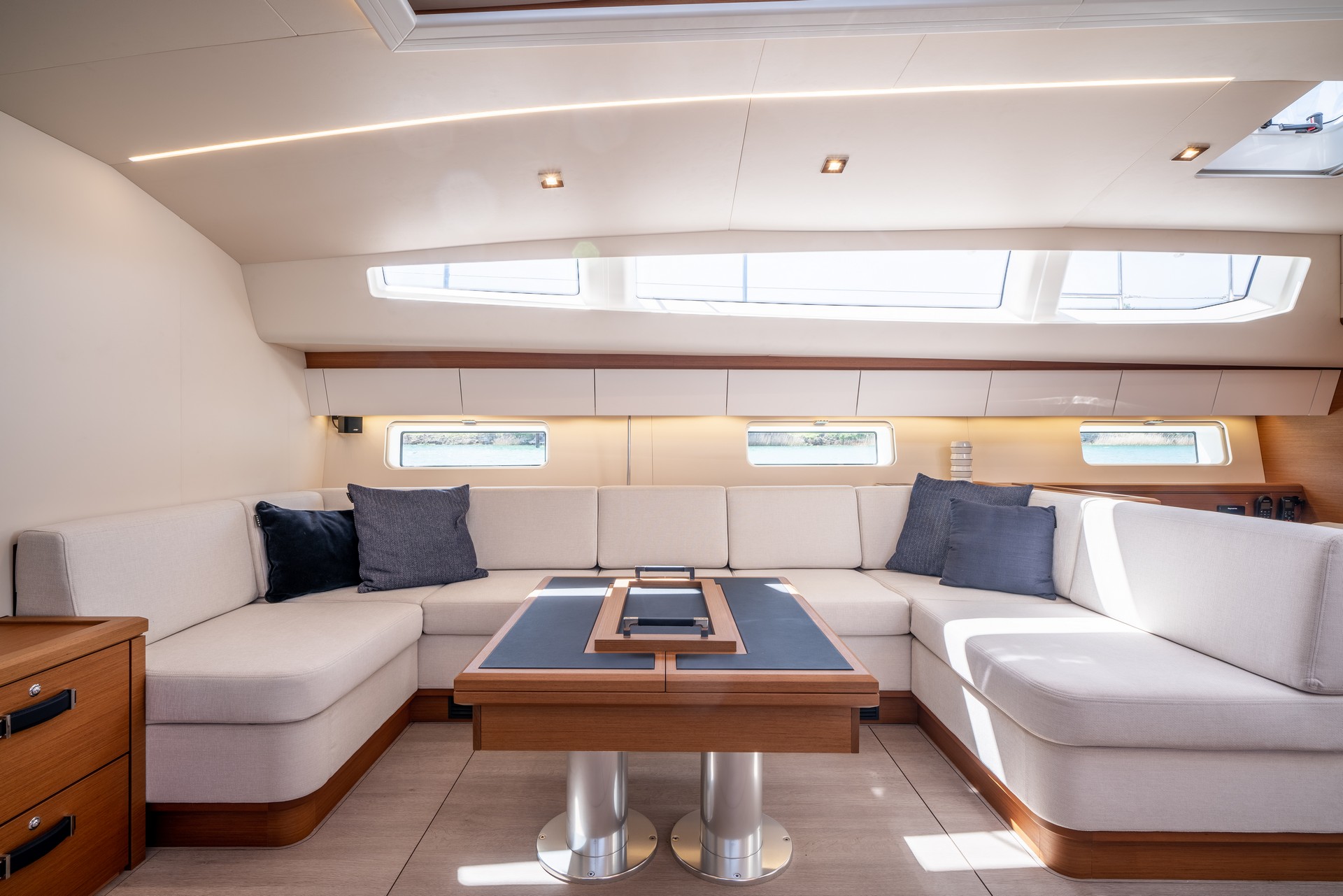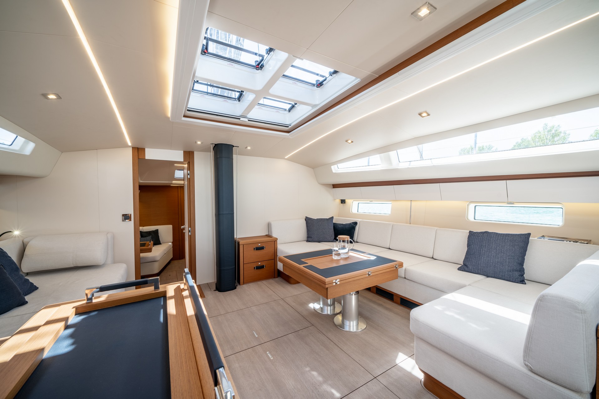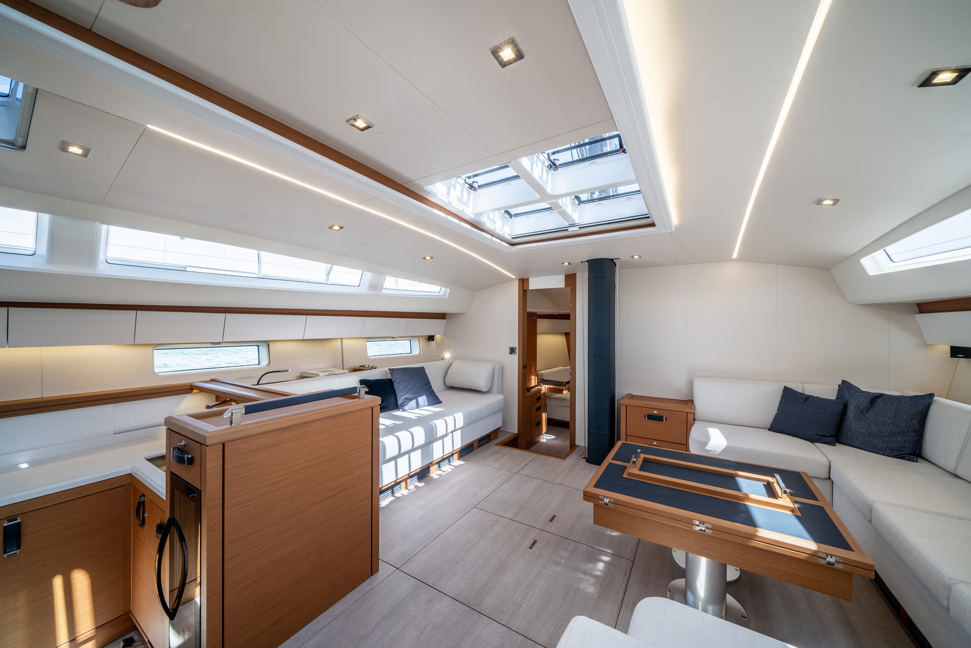 Il Jeanneau Yachts 65 offre zone living che combinano sottilmente benessere e sicurezza, raffinatezza e relax con una splendida vista sul mare.