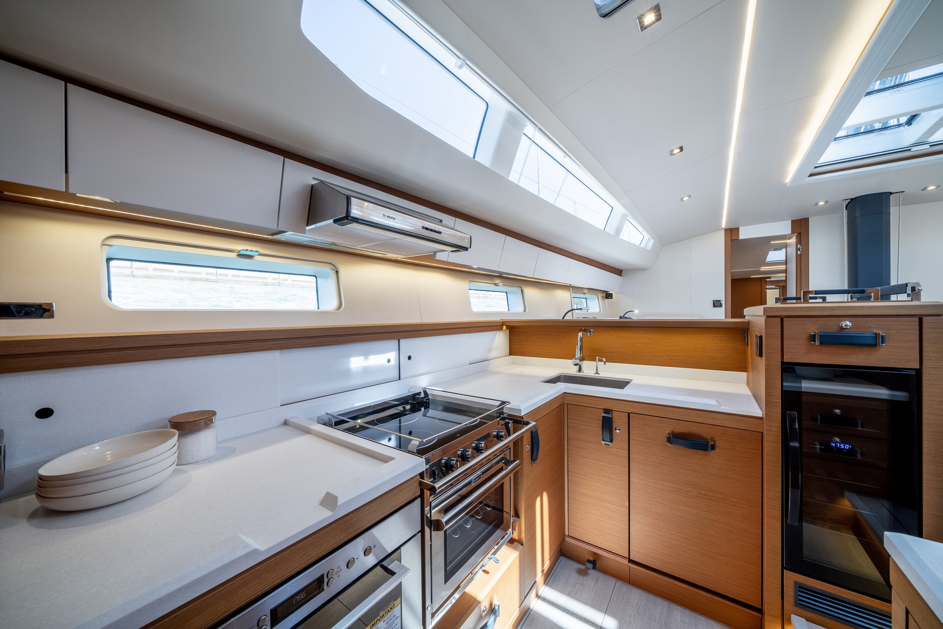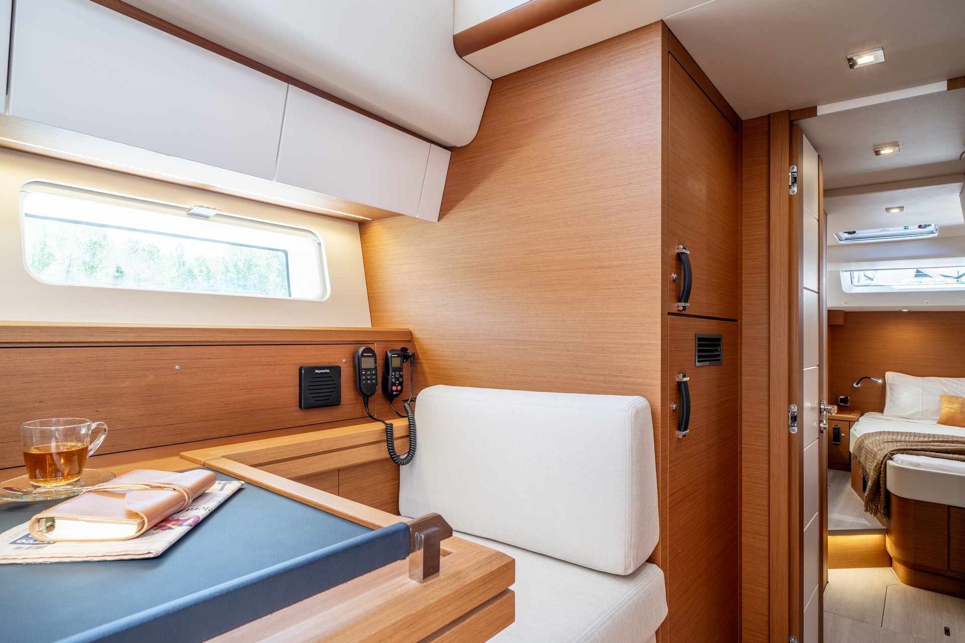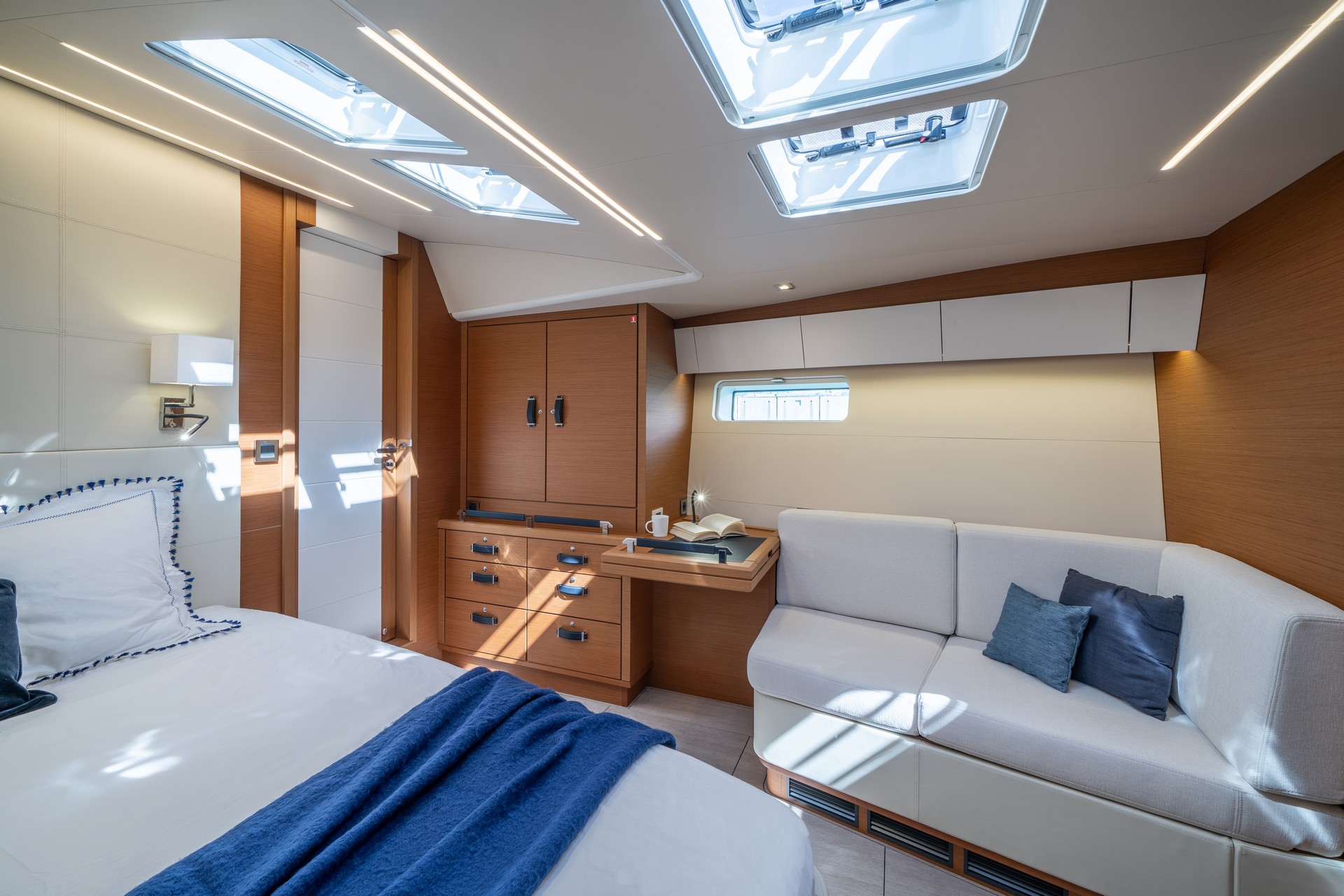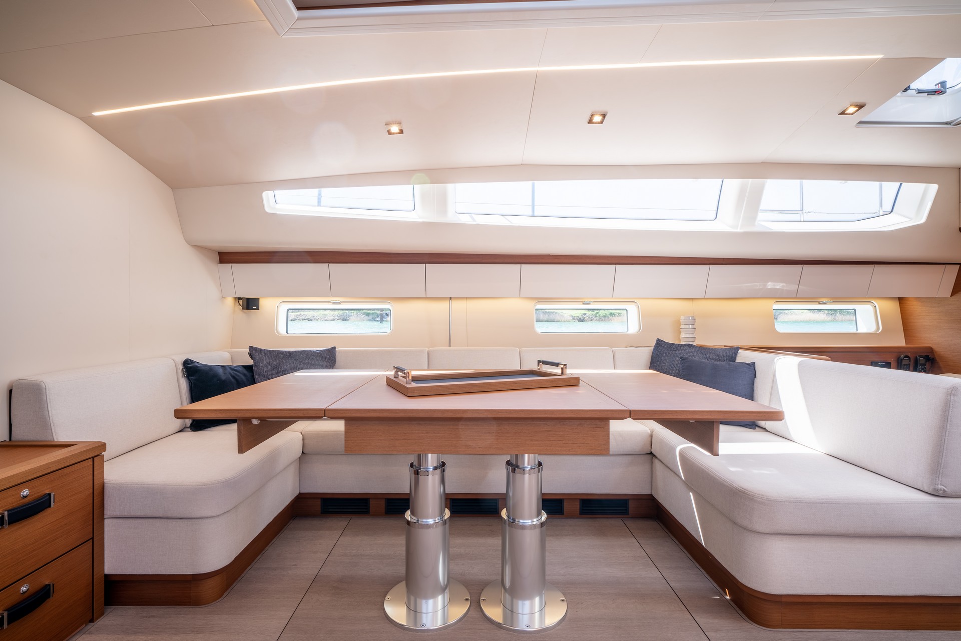 Il Jeanneau Yachts 65 offre zone living che combinano sottilmente benessere e sicurezza, raffinatezza e relax con una splendida vista sul mare.