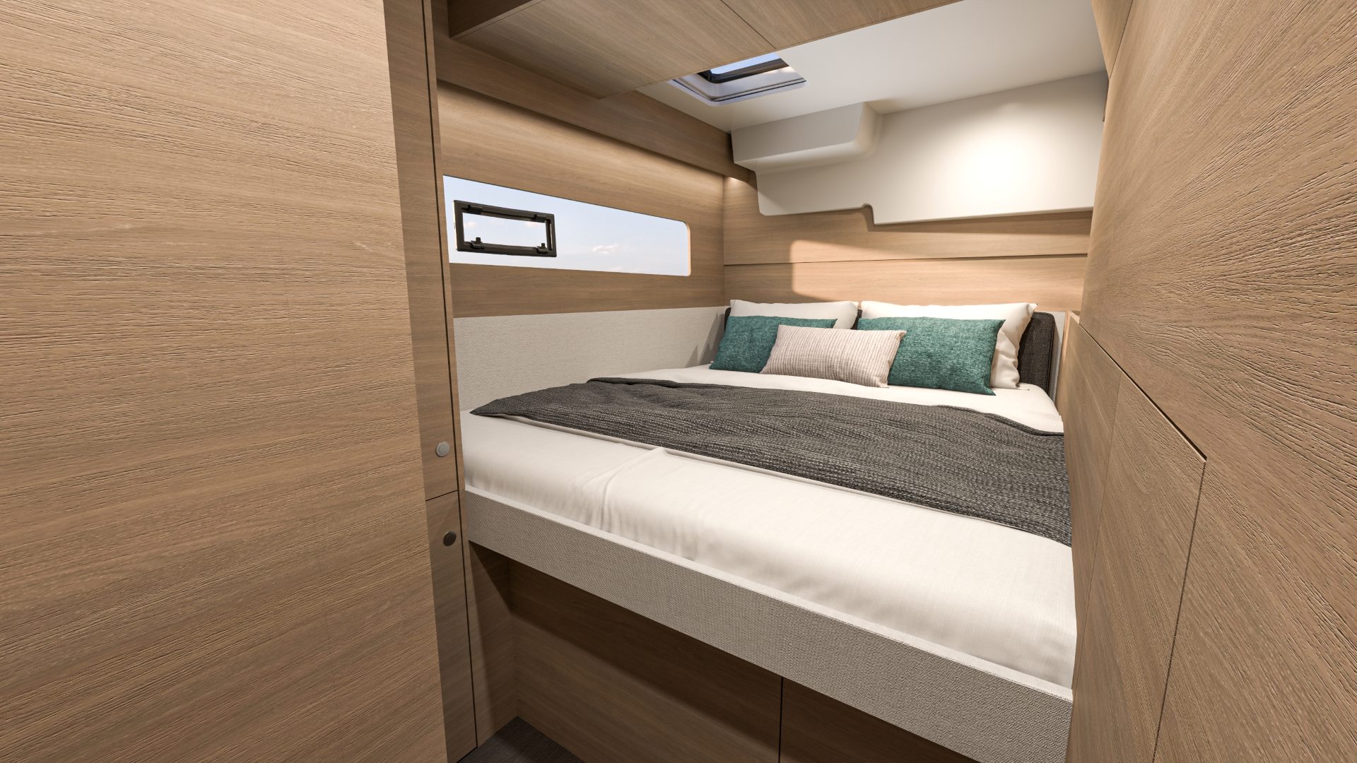 La sua ampia cuccetta nella parte anteriore e il bagno nella parte posteriore garantiscono risparmio di spazio e generosi spazi di stivaggio.