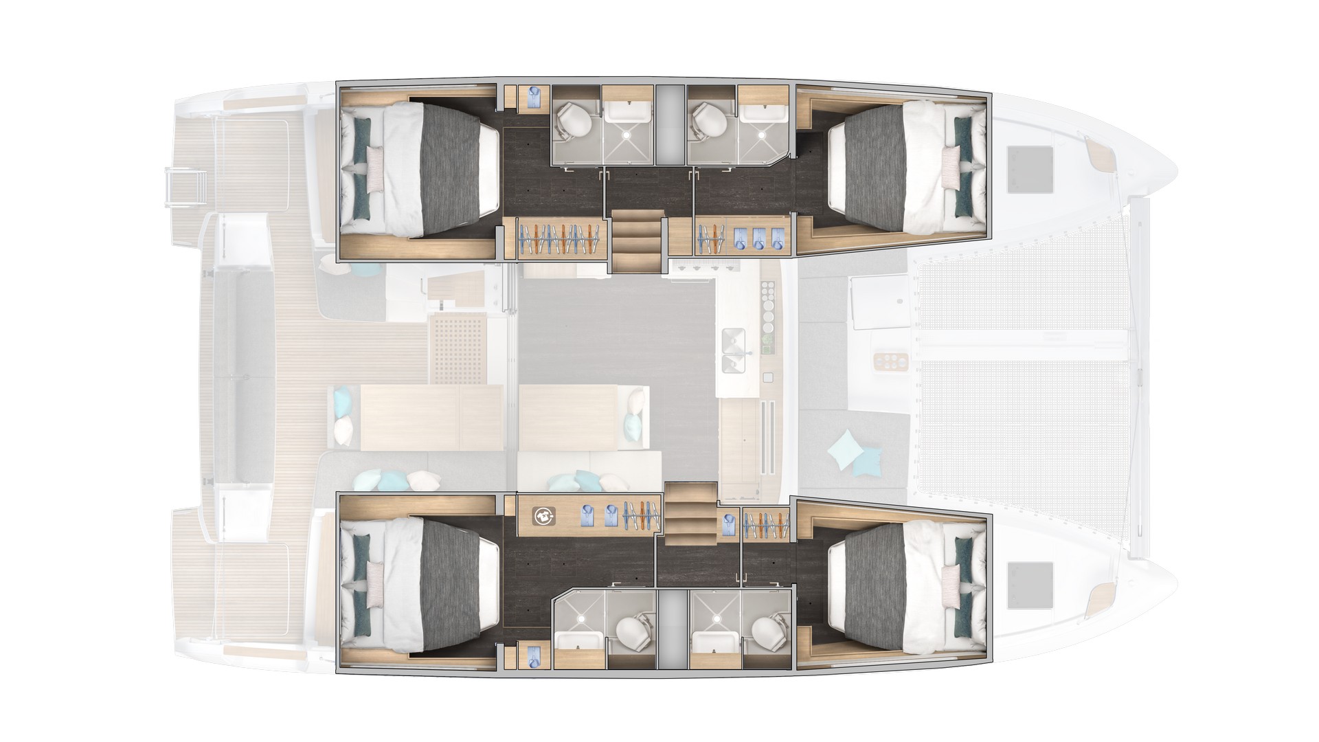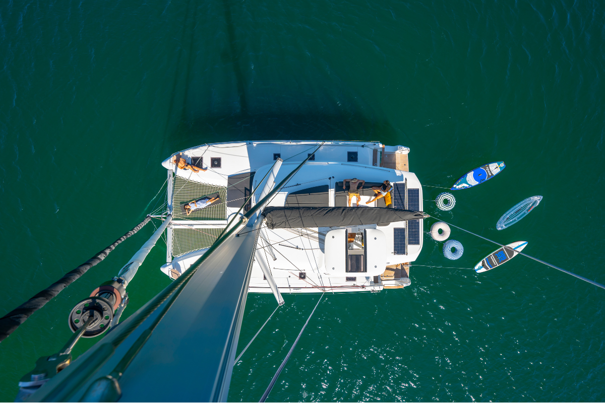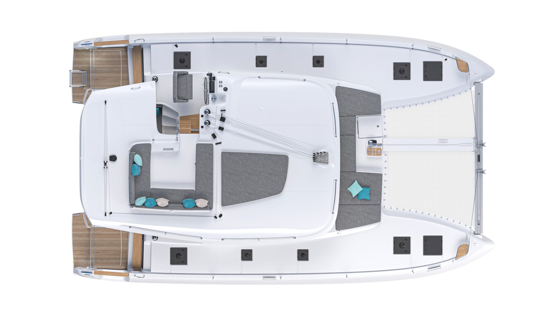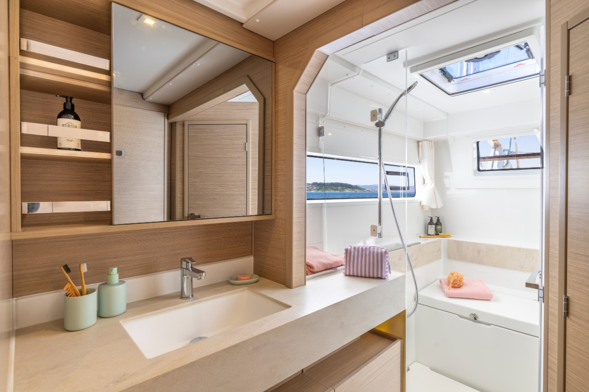 Per questo nuovo modello Lagoon ripensa l'accesso al catamarano creando un'ulteriore apertura nella parte posteriore degli scafi. Questa soluzione innovativa agevola la circolazione tra l'imbarcazione e la banchina, coniugando sicurezza e comfort, nell'ottica del benessere a bordo.