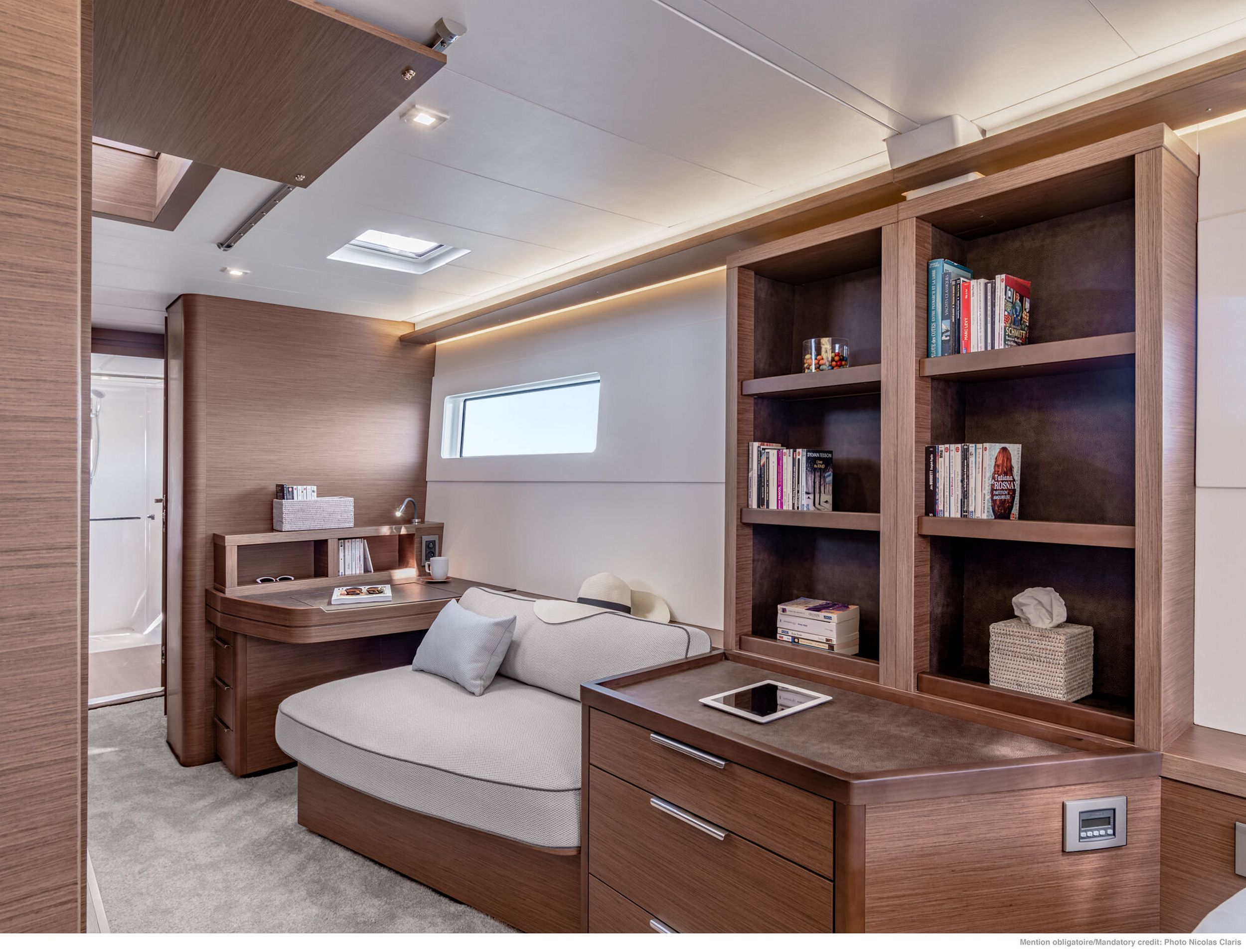 Firmati Nauta Design, gli interni si caratterizzano per uno stile raffinato, elegante e funzionale. Gli spazi riservati all’armatore privati sono generosi, con un letto island che offre il massimo comfort. Ma anche le altre cabine sono decisamente spaziose, in particolare quella di prua in cui il letto non ha nulla da invidiare rispetto alle soluzioni di poppa. Per migliorare la qualità della vita di bordo, sono particolarmente curate le finiture e la luminosità interna. L'elemento di connessione tra il pozzetto di prua e il quadrato è una finestratura scorrevole che crea una sensazione di spazio infinito e garantisce un’eccellente ventilazione.