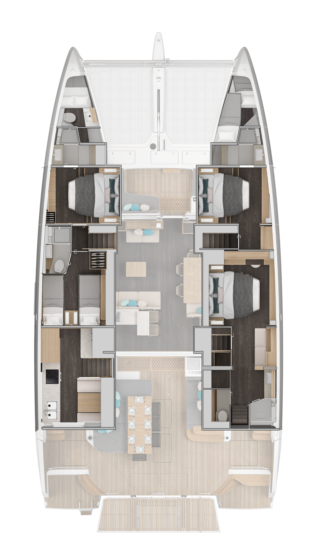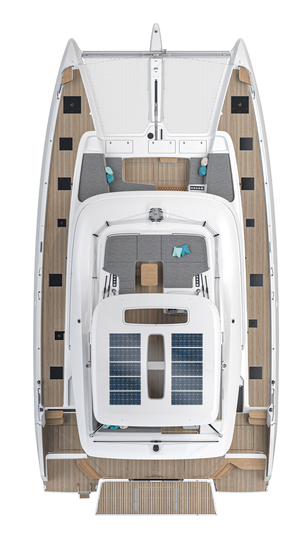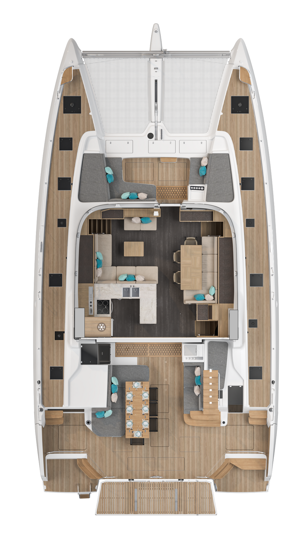 Accessibile attraverso una porta nella parte anteriore del salone verso prua , senza differenze di livello del pavimento tutto in piano, il pozzetto di prua offre un'ampia zona relax confortevole e accogliente. Una vista panoramica ti viene offerta ogni volta che cambi spazio. Nessun ostacolo impedisce la tua circolazione dalla poppa fino alla parte anteriore del catamarano.