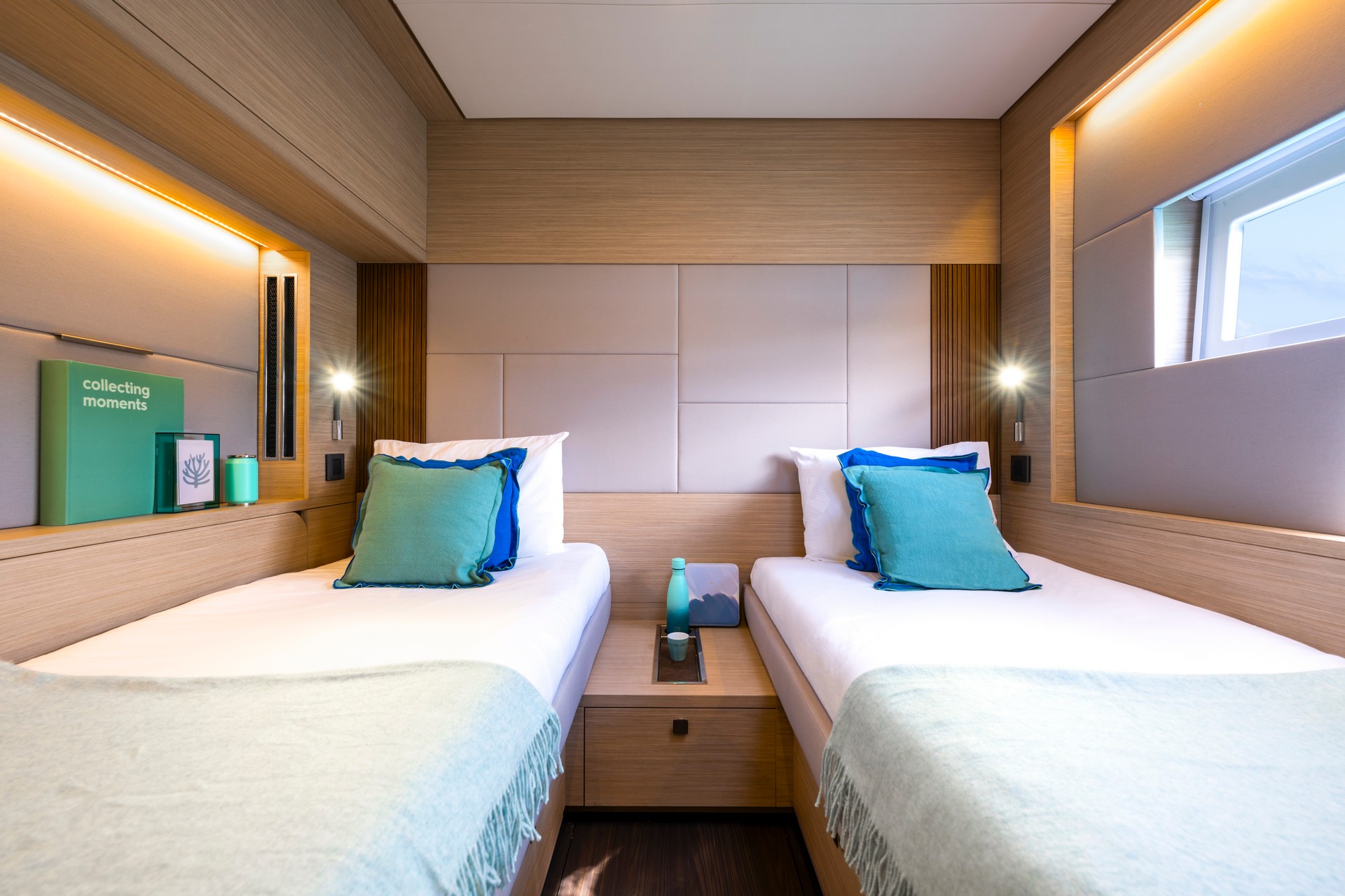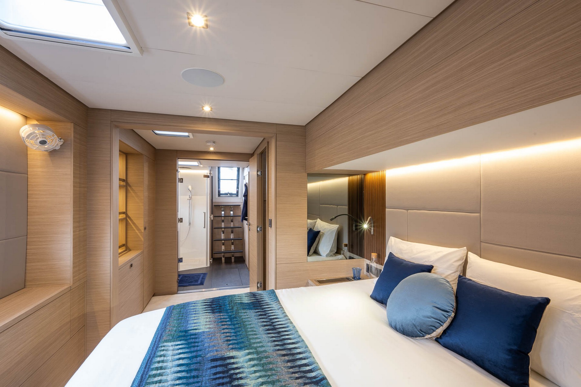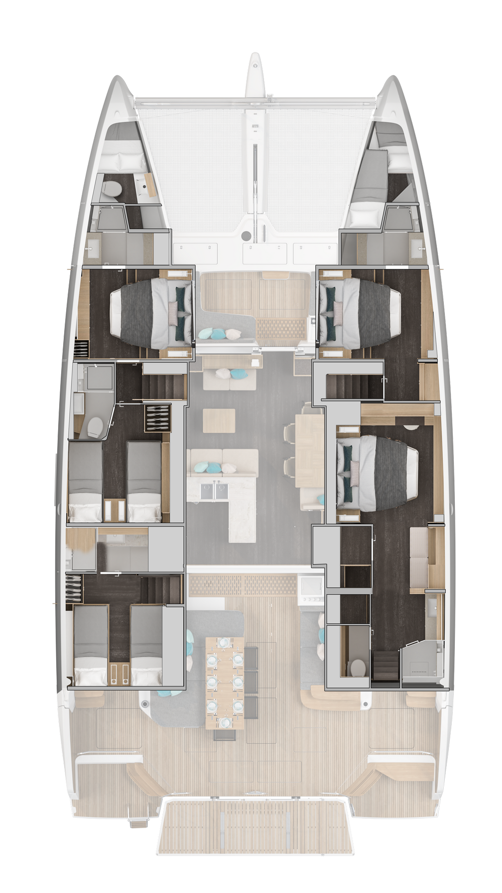 Accessibile attraverso una porta nella parte anteriore del salone verso prua , senza differenze di livello del pavimento tutto in piano, il pozzetto di prua offre un'ampia zona relax confortevole e accogliente. Una vista panoramica ti viene offerta ogni volta che cambi spazio. Nessun ostacolo impedisce la tua circolazione dalla poppa fino alla parte anteriore del catamarano.