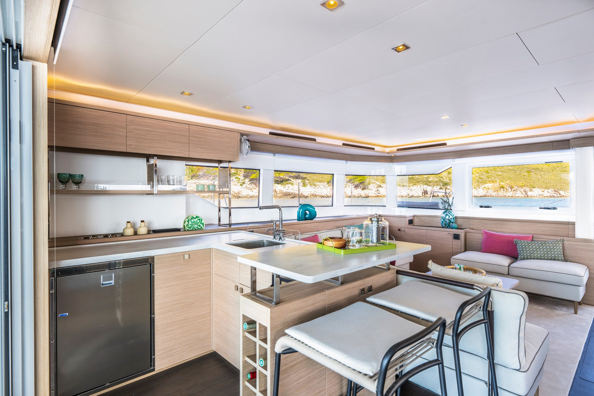 Prendi gli ampi gradini del Lagoon 60 e sali a bordo! Il pozzetto di poppa ti accoglie rivelando tutto il suo potenziale al primo sguardo. La vita a bordo non è mai stata così promettente.