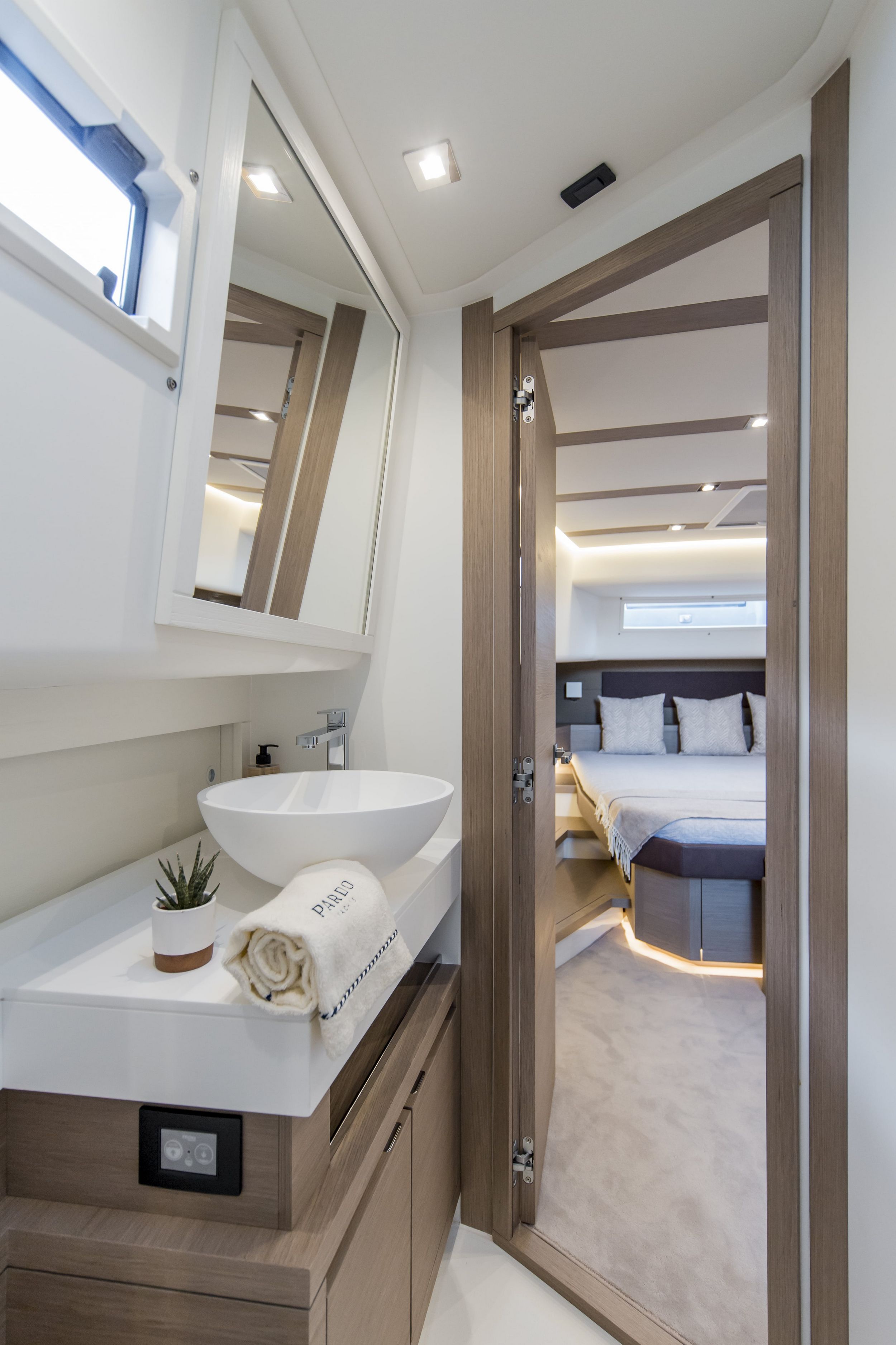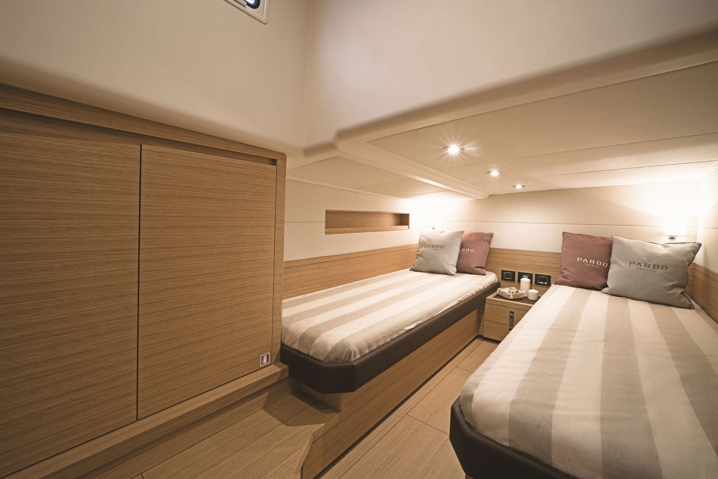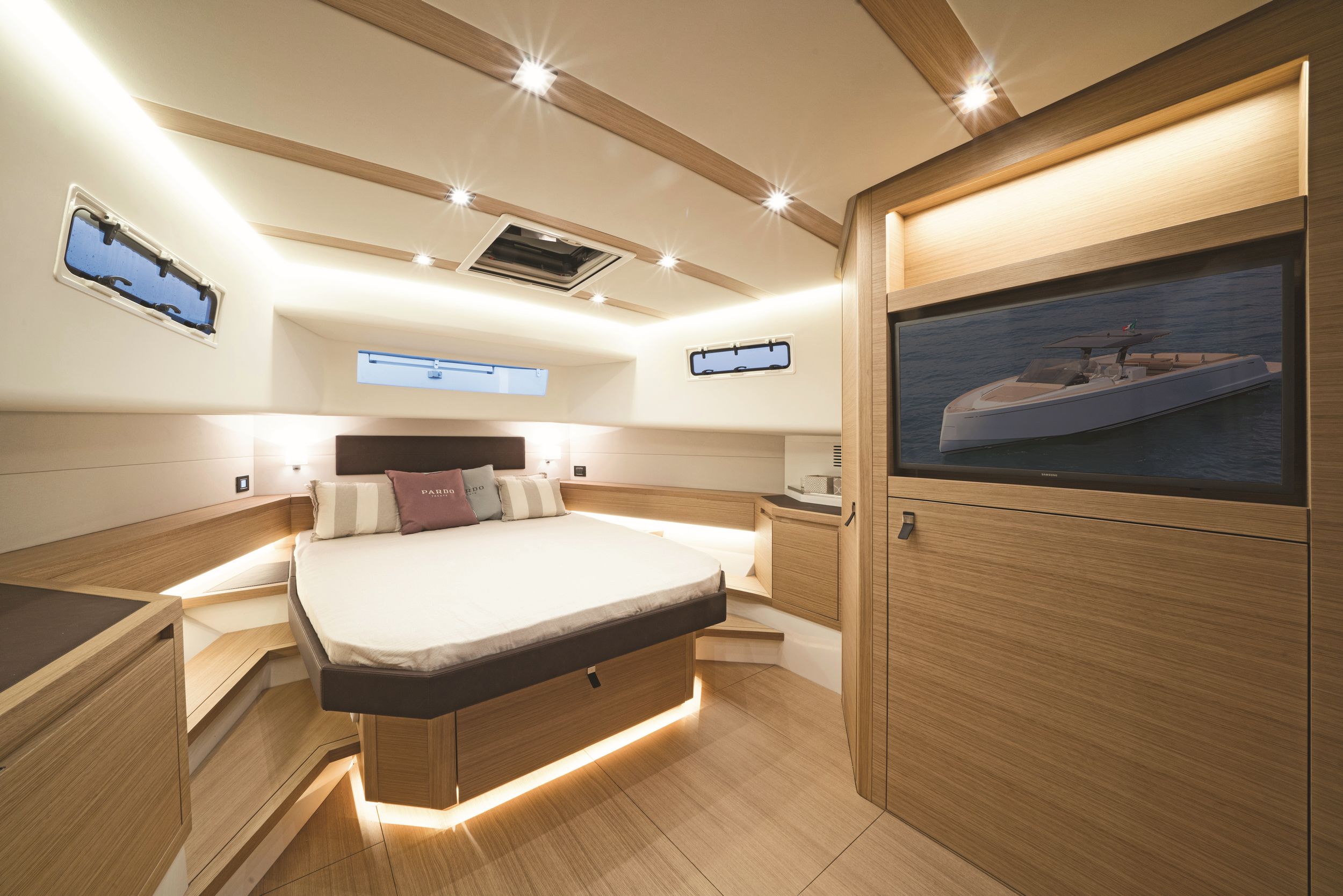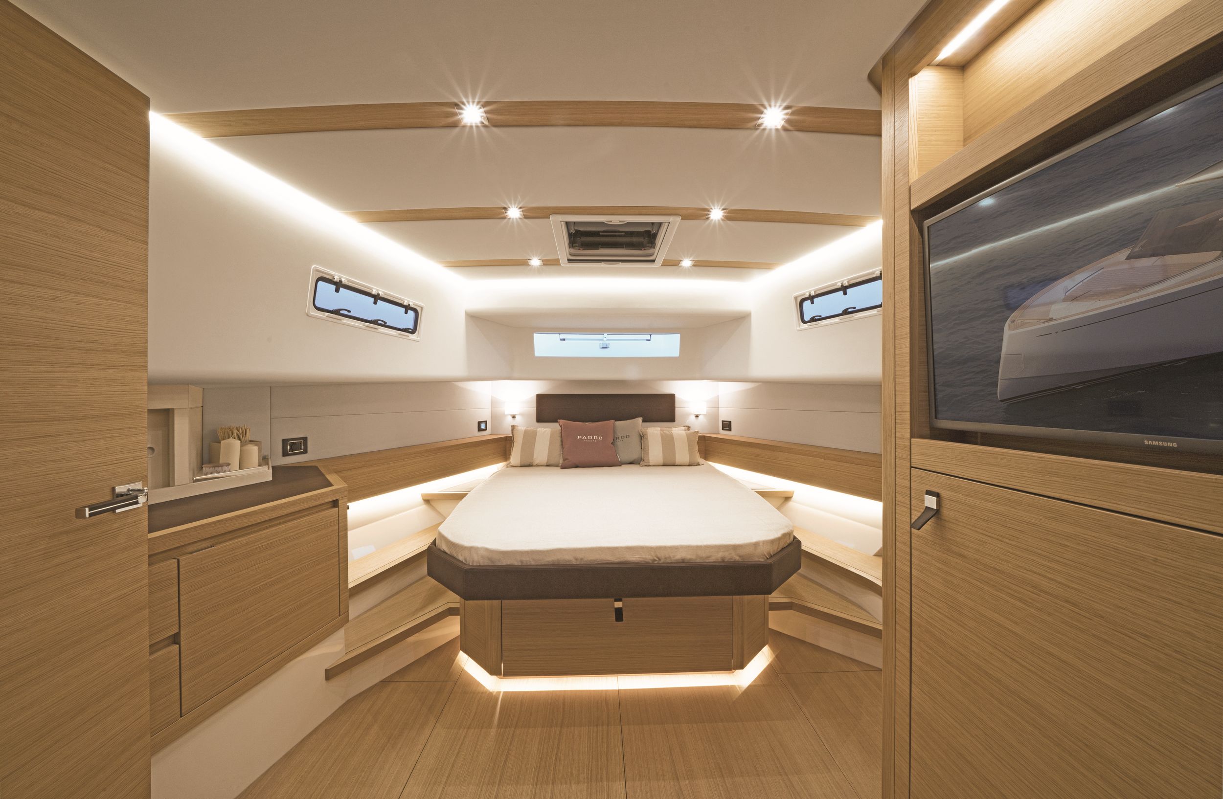Caratteristica forte degli interni sono le altezze ottimali, il grande open space con due cabine e due bagni, la possibilità di avere anche la cabina per il marinaio. la linearità e la raffinatezza degli arredi vengono esaltati dall’accurata scelta dei legni e dall’attenzione ai dettagli che rendono gli interni del Pardo 50 un’eccellenza del made in italy.