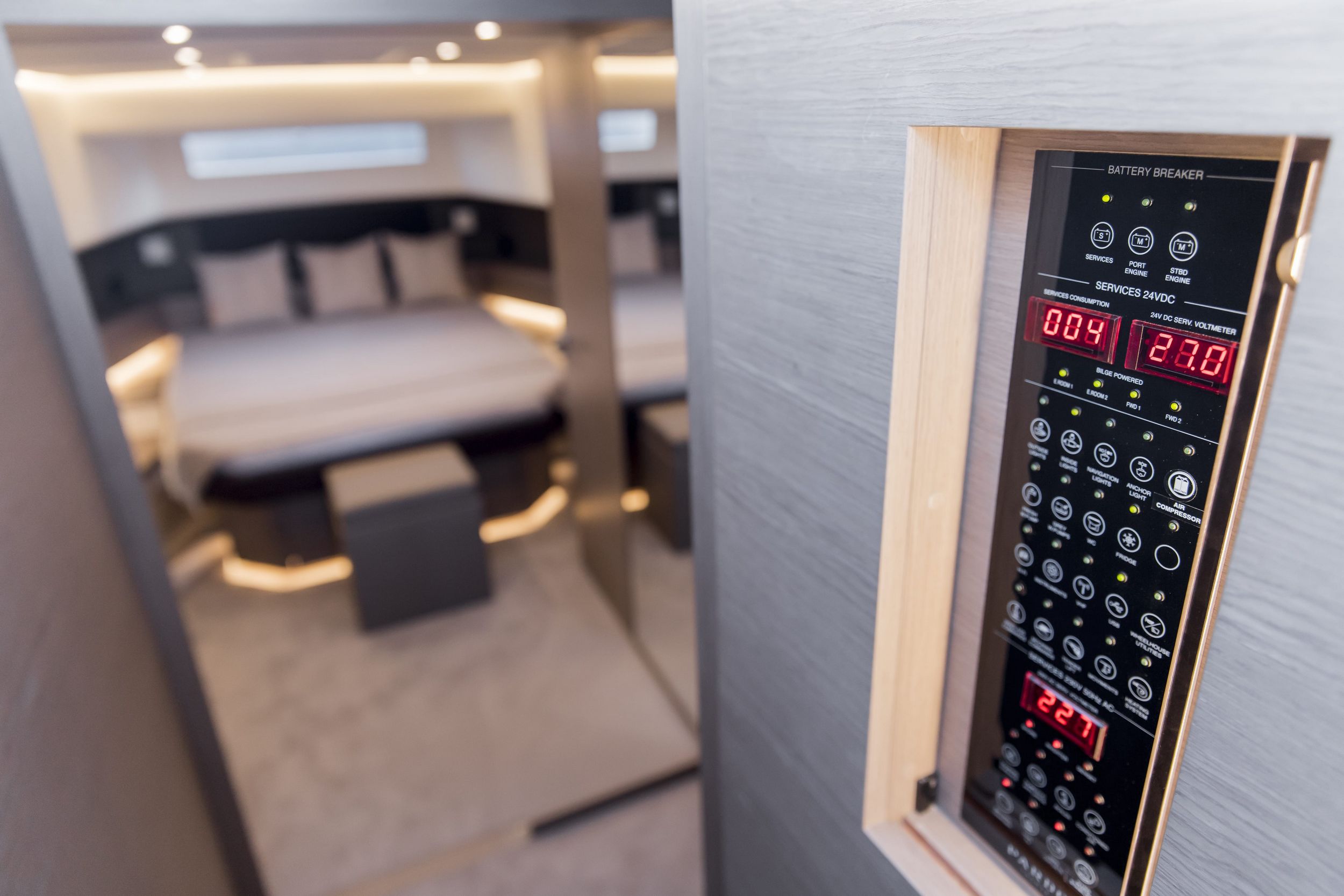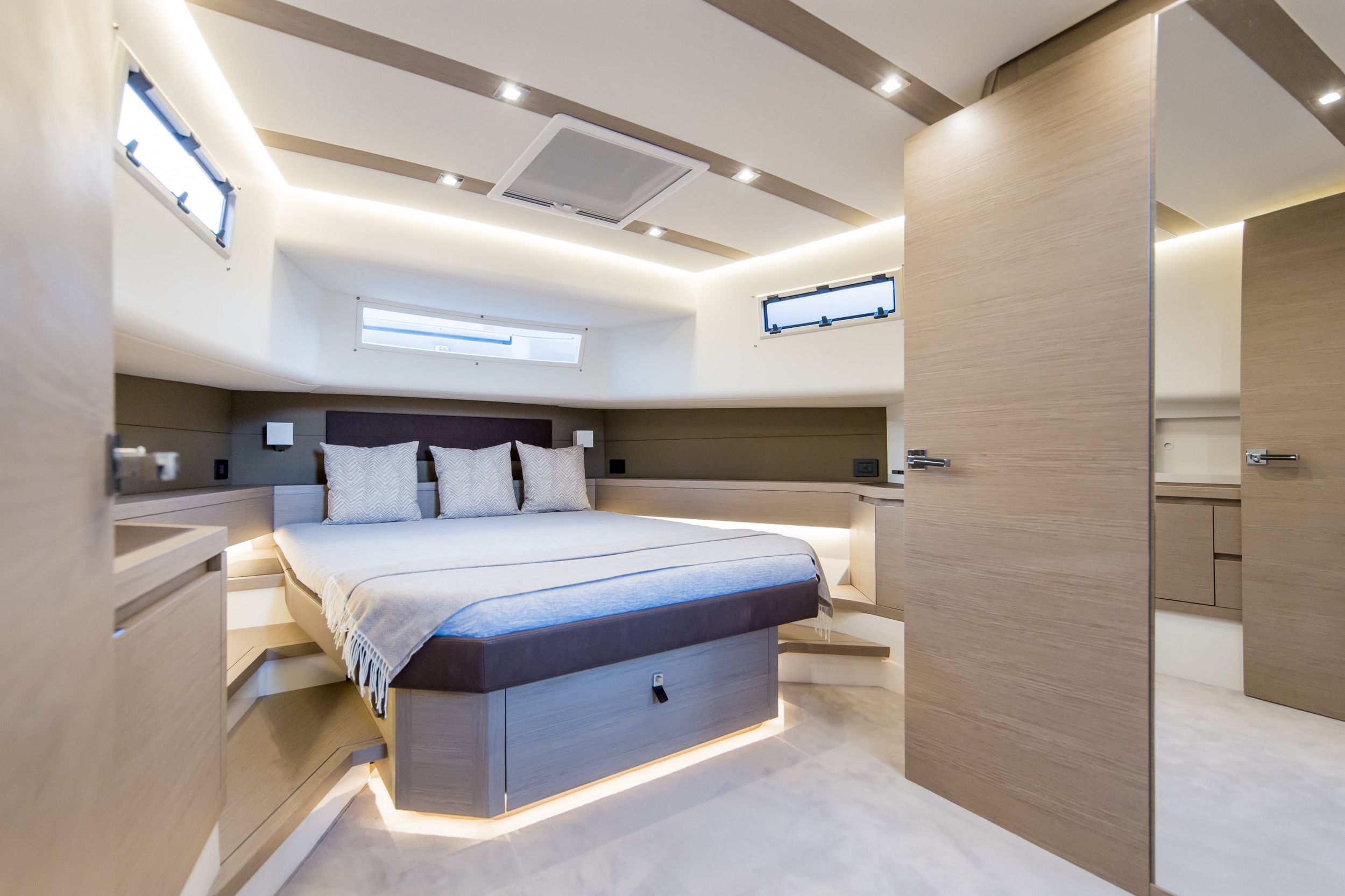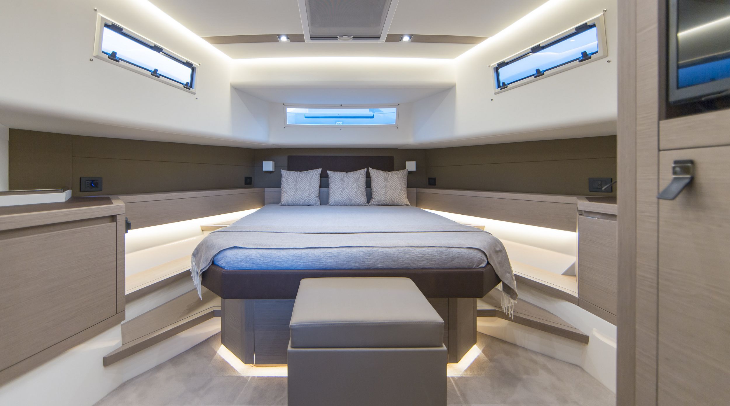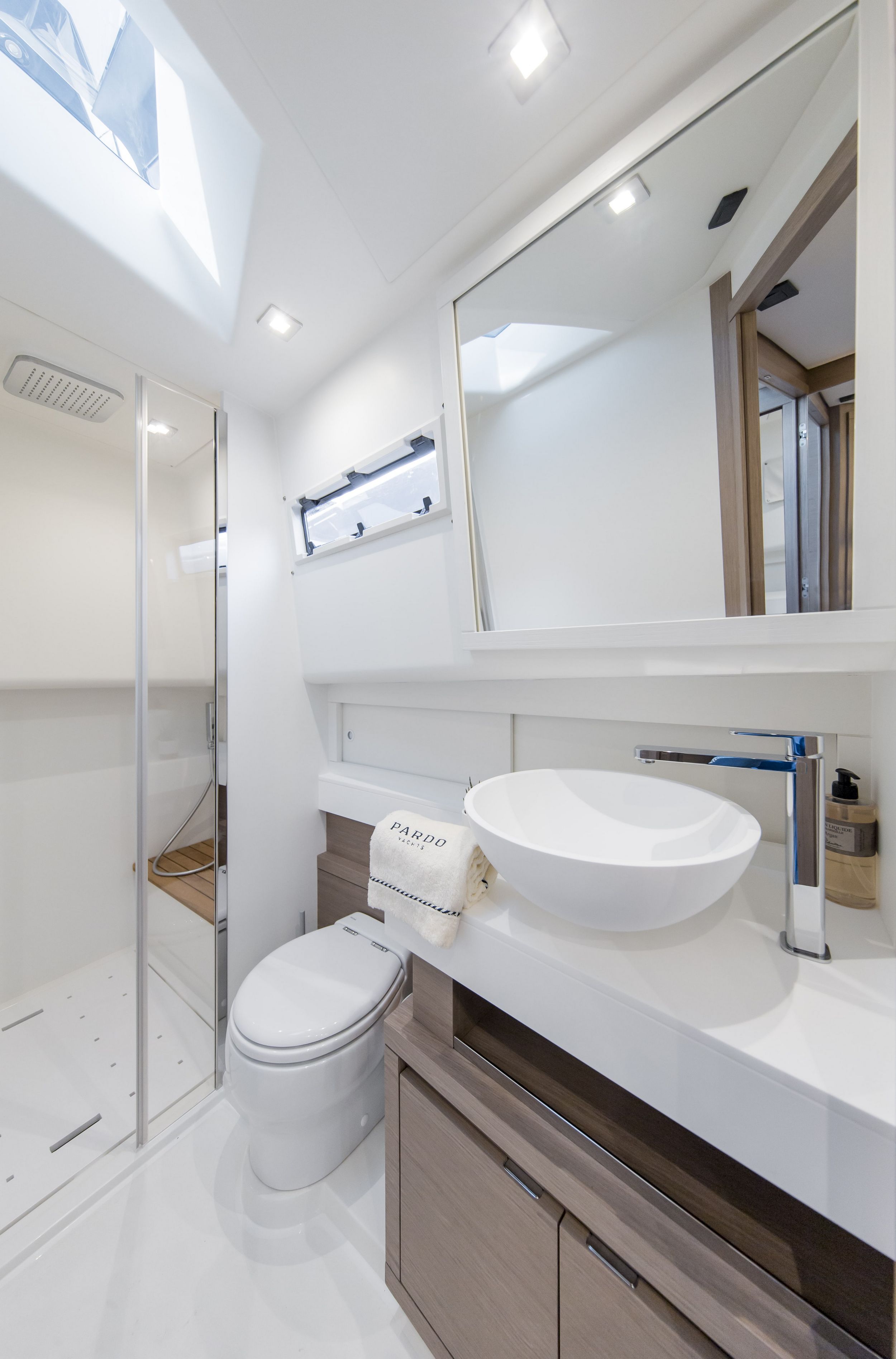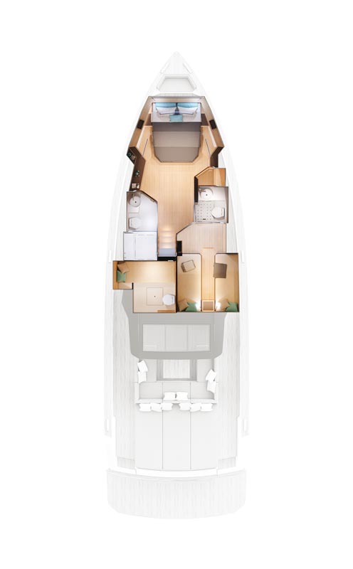 Caratteristica forte degli interni sono le altezze ottimali, il grande open space con due cabine e due bagni, la possibilità di avere anche la cabina per il marinaio. la linearità e la raffinatezza degli arredi vengono esaltati dall’accurata scelta dei legni e dall’attenzione ai dettagli che rendono gli interni del Pardo 50 un’eccellenza del made in italy.