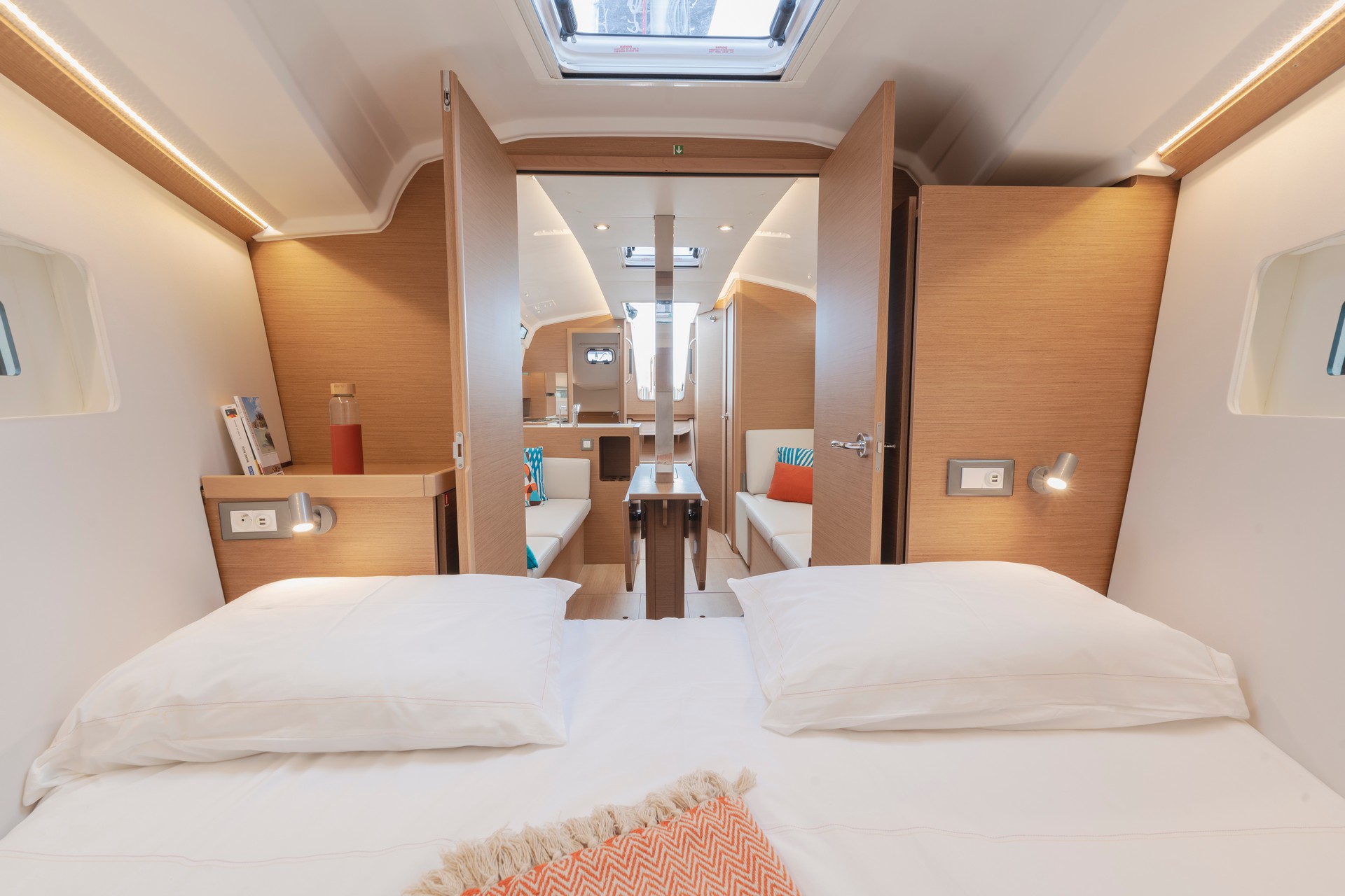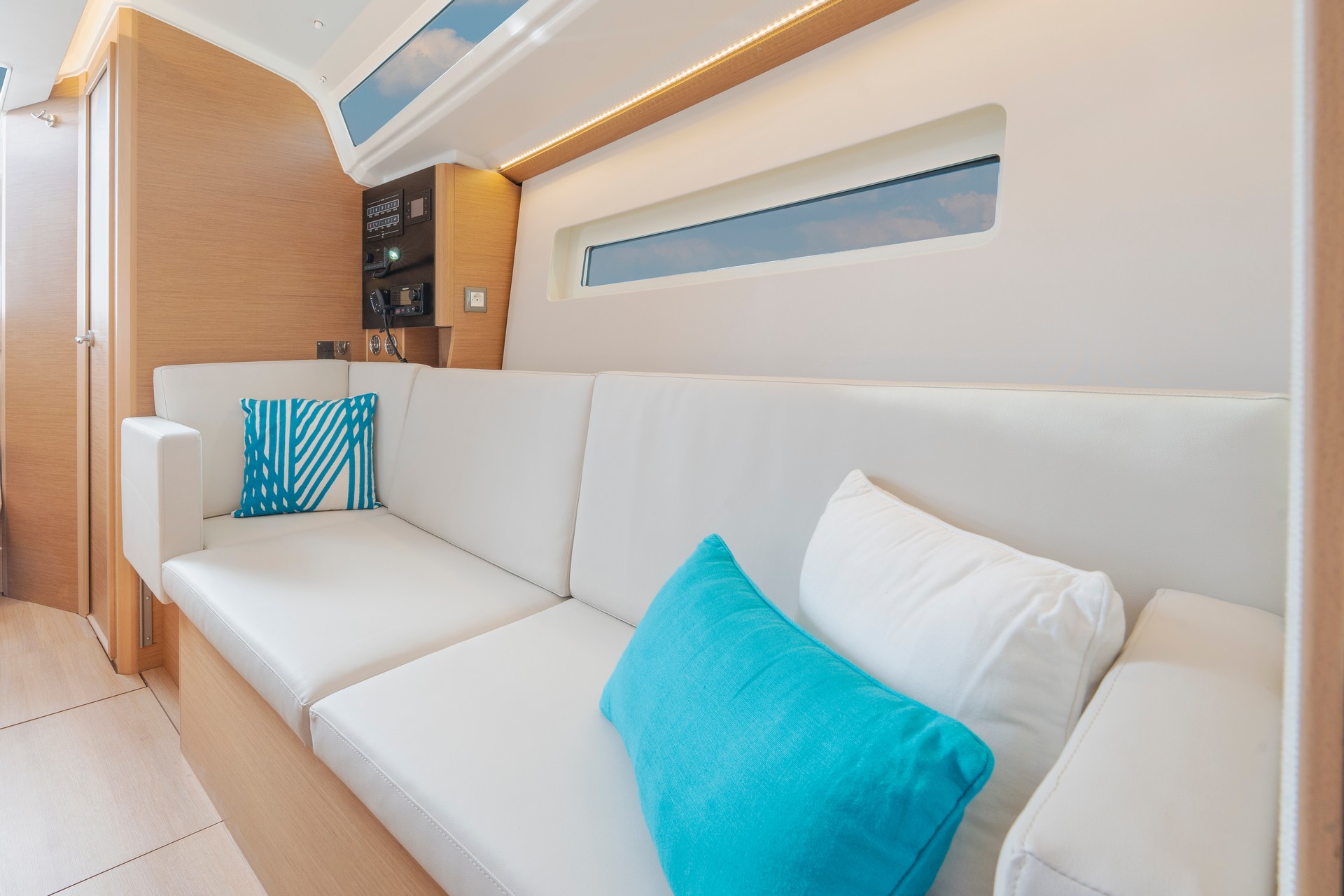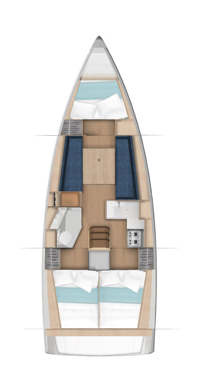 Durante le belle crociere in famiglia, il quadrato della barca, dal design moderno e contemporaneo, accoglierà l’equipaggio. Gli interni sono luminosissimi grazie alle ampie vetrate dello scafo e del tetto. La sera la luce indiretta rende l’atmosfera a bordo serena e calorosa. Con un’altezza sottocoperta ovunque di oltre 1,85 metri, il quadrato e le cabine offrono una piacevole sensazione di spazio. Con il Sun Odyssey 350 gli appassionati del mare e degli spruzzi d’acqua vivranno esperienze all’insegna del benessere e della serenità.