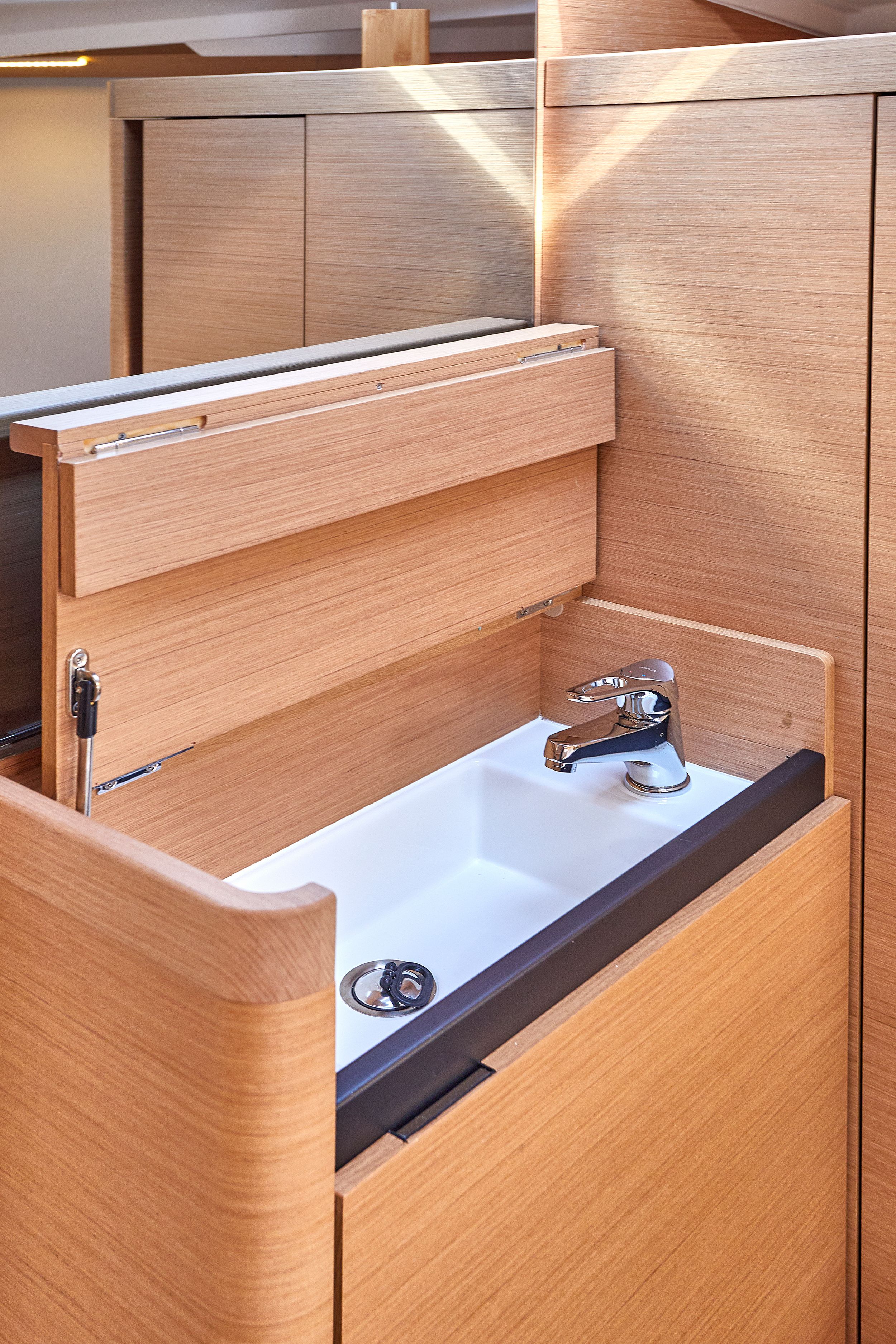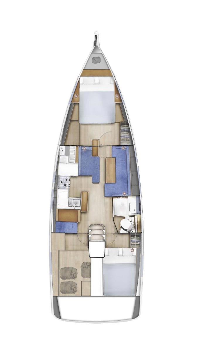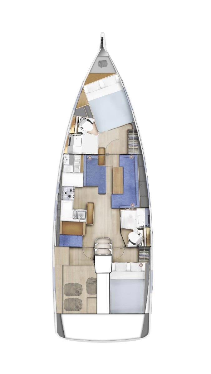 Il Sun Odyssey 410 propone diversi layout interni, in versione 2 o 3 cabine. Lo spazio puà essere modulato in ampio workshop.