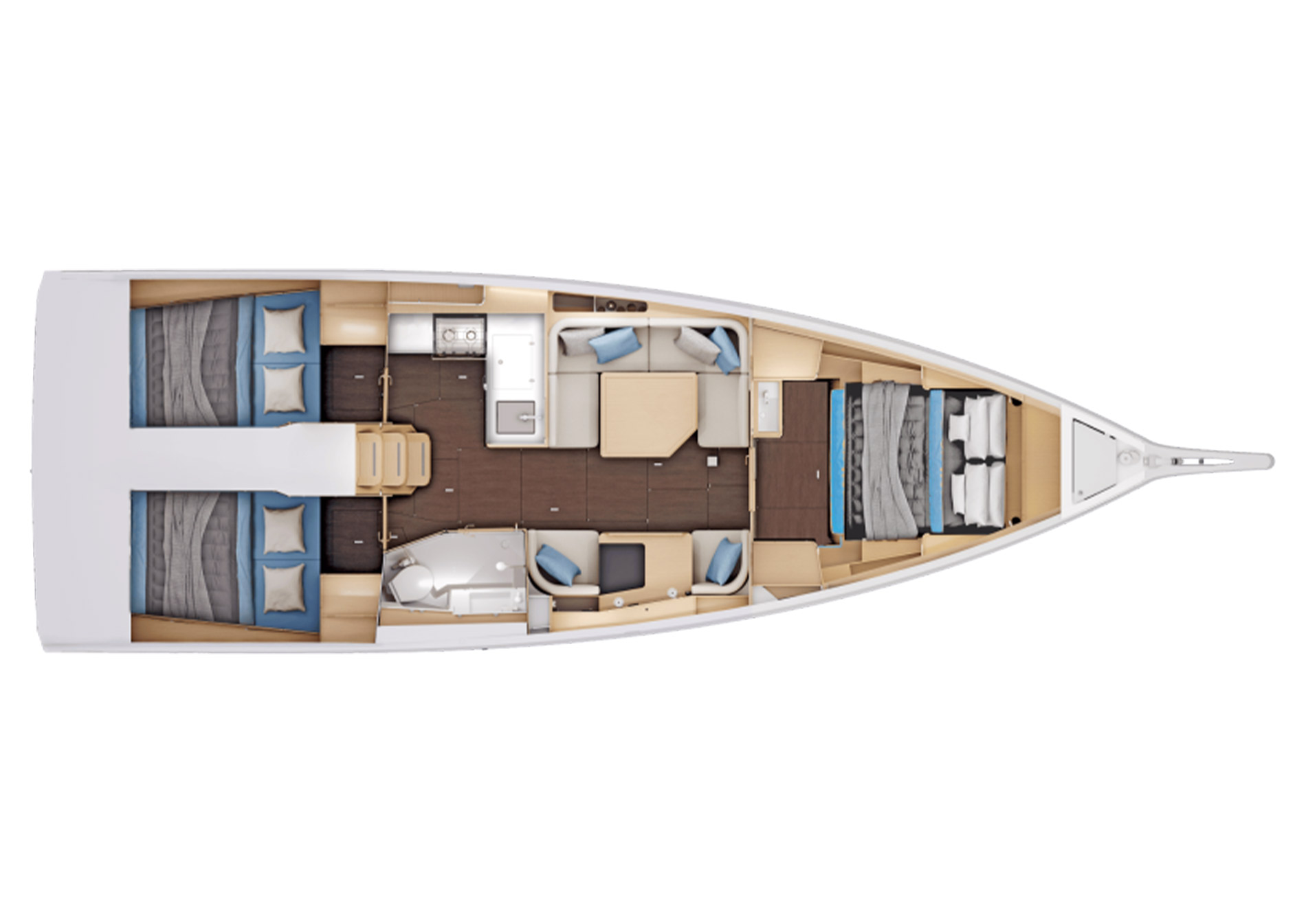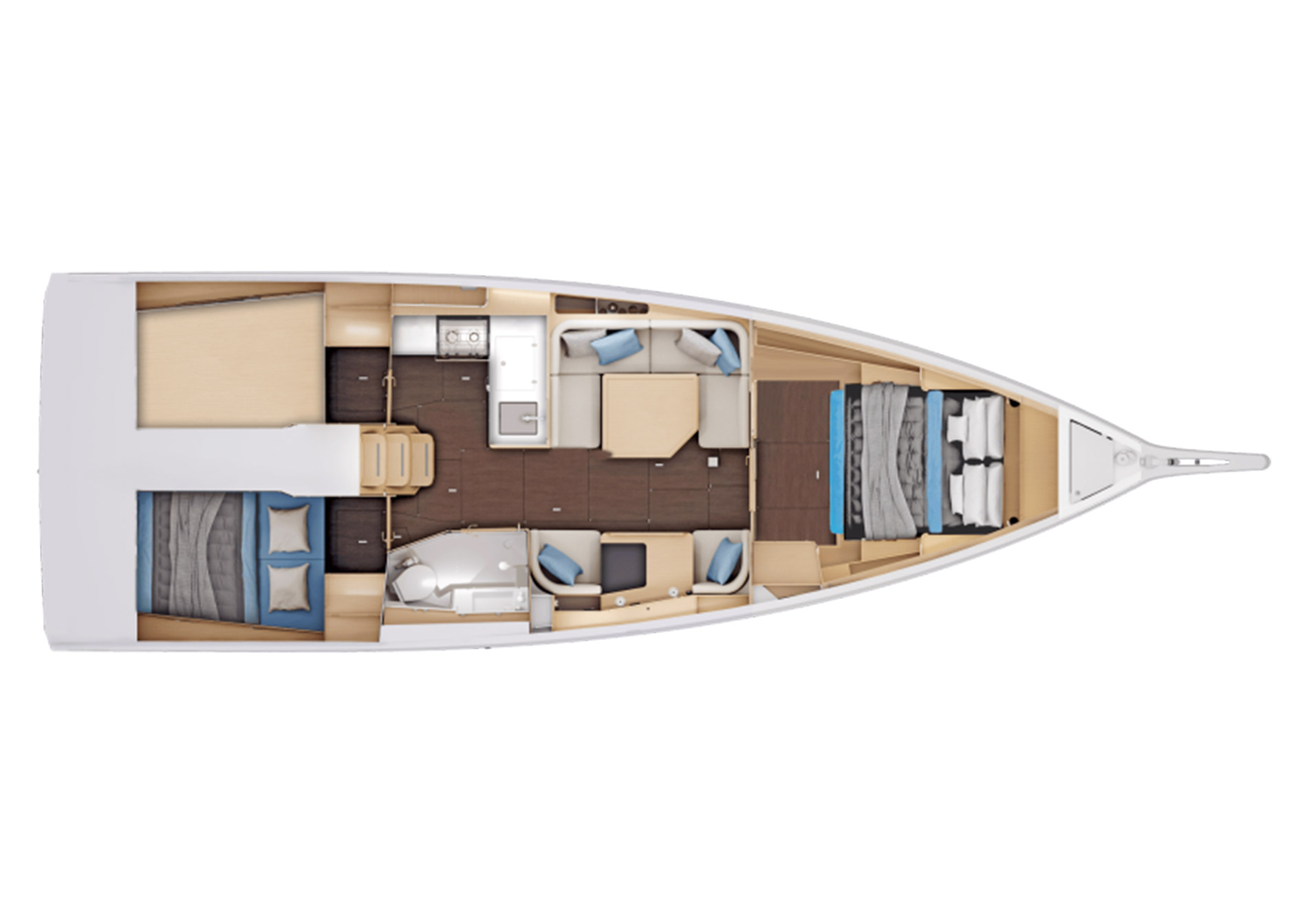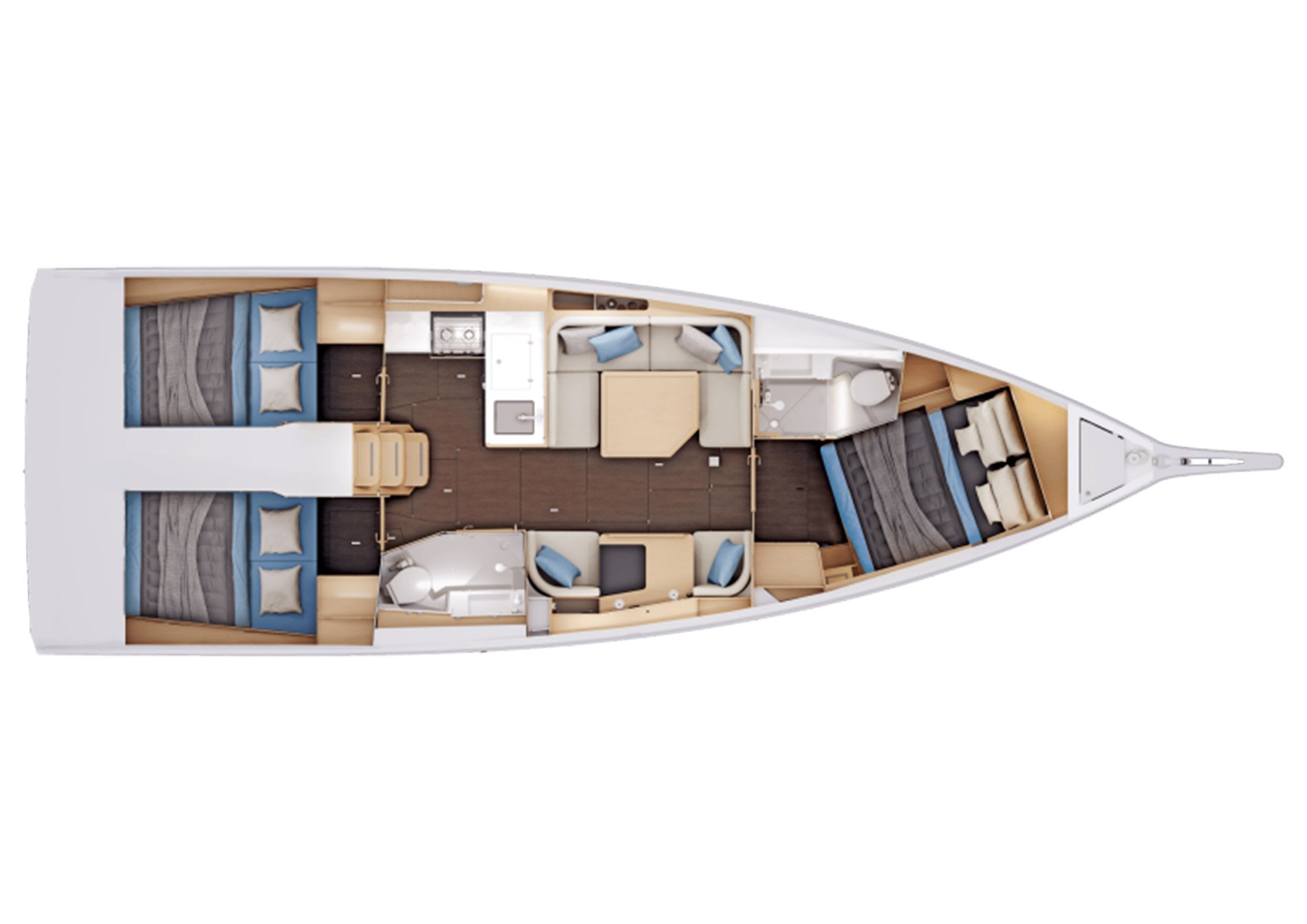 Il layout degli interni, completamente riprogettato rispetto alla generazione precedente, comprende una cucina a L e un accogliente quadrato. Un tavolo da carteggio per due, nel senso di marcia, completa un allestimento decisamente funzionale. Situata in posizione ideale in fondo alla scala di discesa, la cucina a L comunica perfettamente con l'esterno. L'allestimento offre numerosi spazi di stoccaggio funzionali e ingegnosi. Il quadrato può ospitare comodamente fino a 5 persone. La luce naturale vi entra abbondantemente grazie alle finestrature dello scafo e del ponte di coperta. Sotto ogni seduta ci sono ampi spazi di stivaggio funzionali e facilmente accessibili. L'innovativo tavolo da carteggio, di fronte alle sedute del quadrato, riunisce tutta le interfacce tecniche necessarie alla gestione dell'imbarcazione. Vi sono inoltre numerosi spazi di stivaggio e una libreria. Questo layout permette di sfruttare al meglio lo spazio disponibile e lo rende ideale per condividere momenti indimenticabili con la famiglia o gli amici.